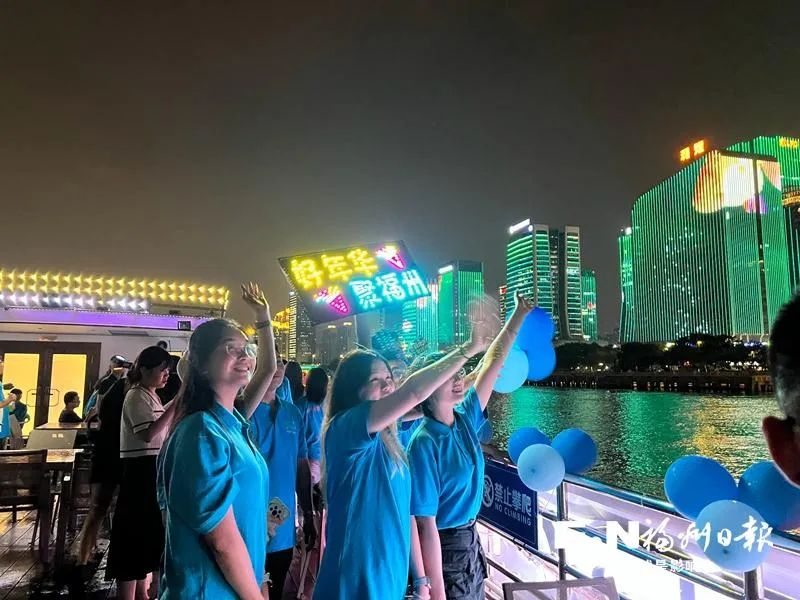 晚上8点半,主题灯光秀亮起“好年华 聚福州”等文字,出现在沿江高楼的立面,两岸青年来到甲板上,伴着音乐放情高歌、拍照留念,更加了解福州、爱上福州。